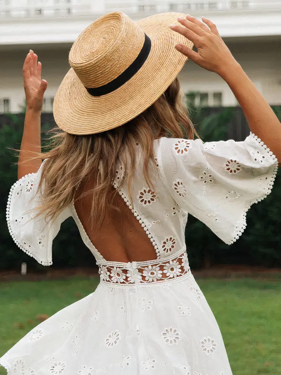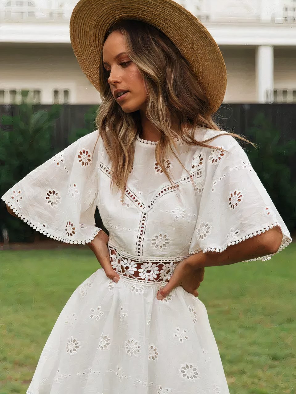 Notre robe bohème chic en coton à broderies est à la fois élégante et confortable. Glamour avec sa coupe courte et son do nu, son col rond haut assagit la silhouette. Elle se ferme dans le bas du dos avec une fermeture éclair. Sa coupe près du corps sans être moulante et son jupon patineuse la rende vraiment agréable à porter.