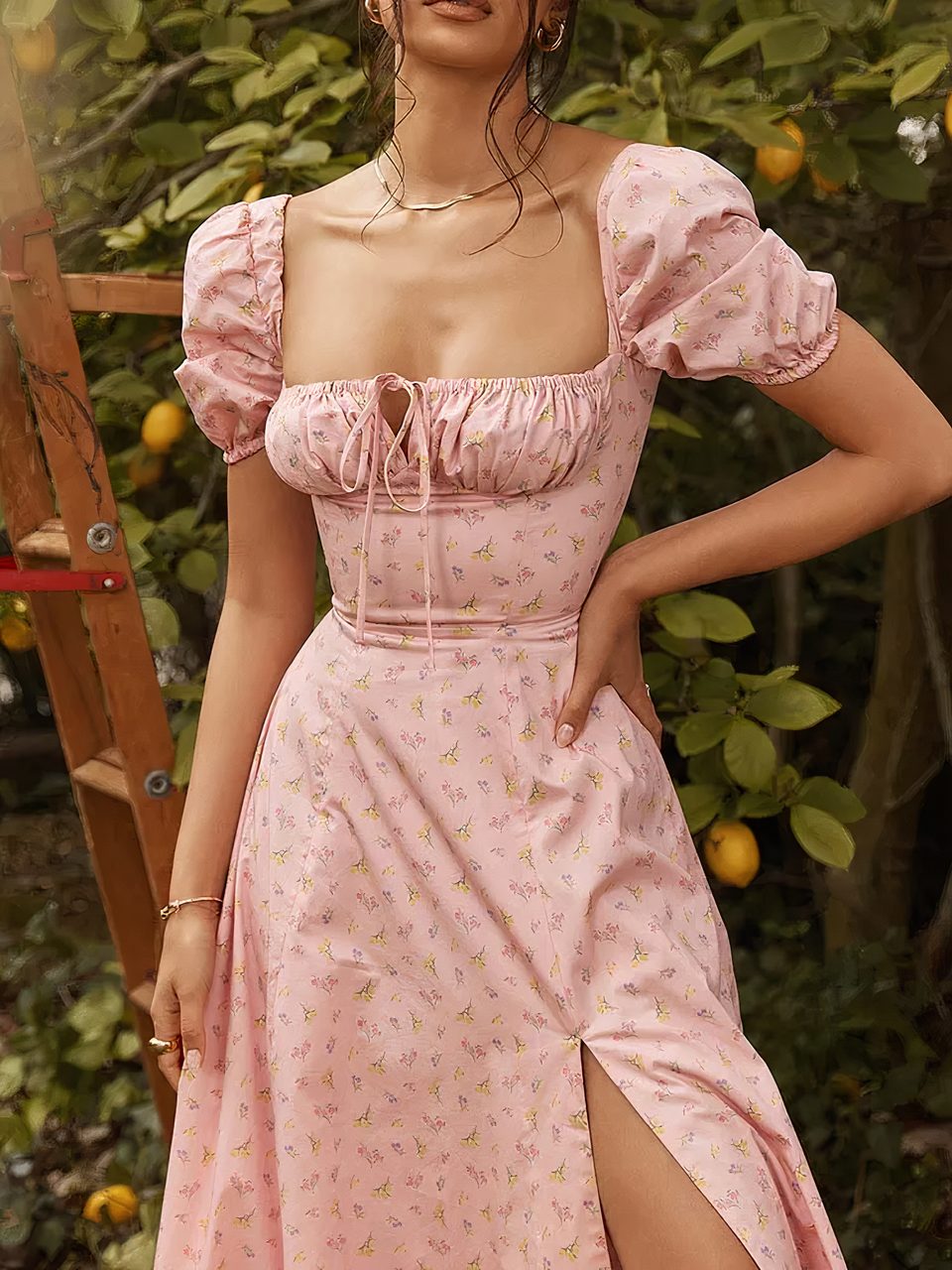 Notre robe Bridgerton fleurie est inspirées des robes d'époque, retravaillée de façon moderne avec une longueur midi, une fente, et un imprimé intemporel. Elle présente également des détails raffinés : des manches bouffantes et un petit noeud sur la poitrine qui permet également de resserrer le décolleté. Pleine de charme, de romantisme et de sensualité, cette robe est confortable à porter et saura vous mettre en valeur en n'importe quelle occasion.