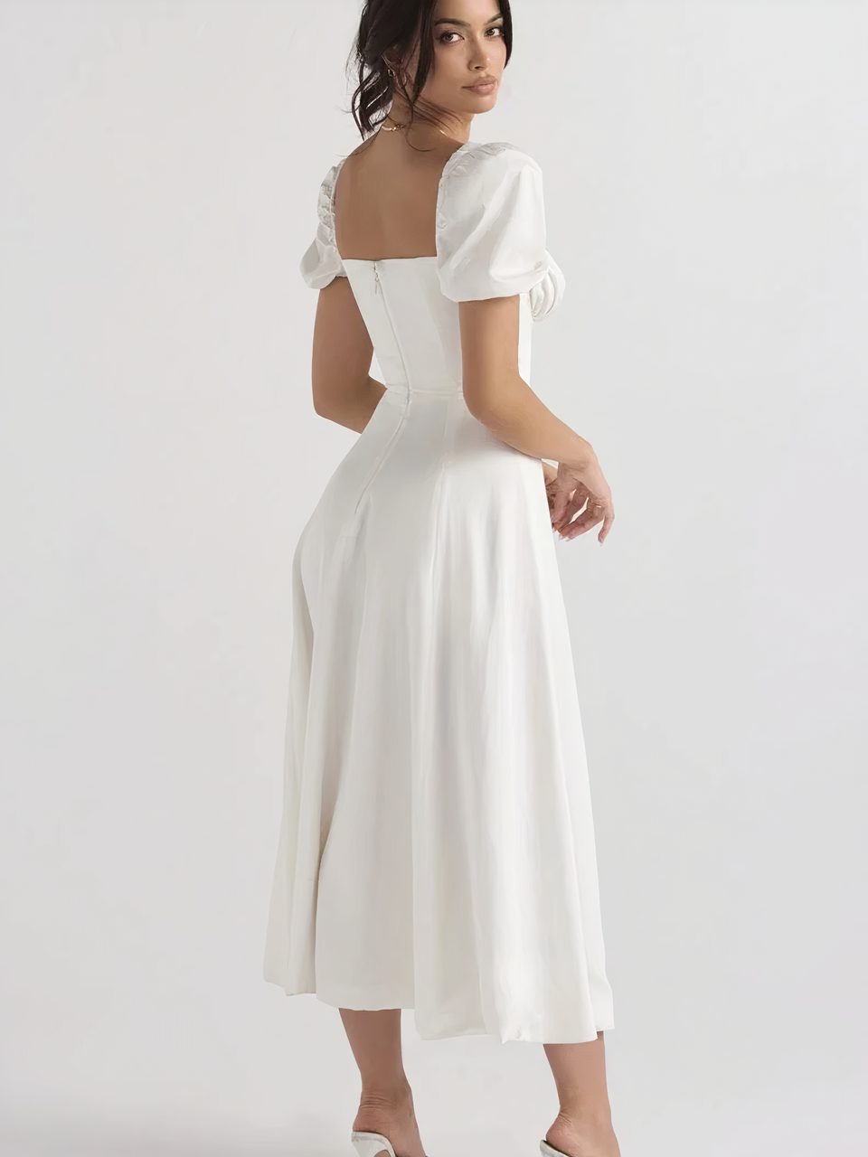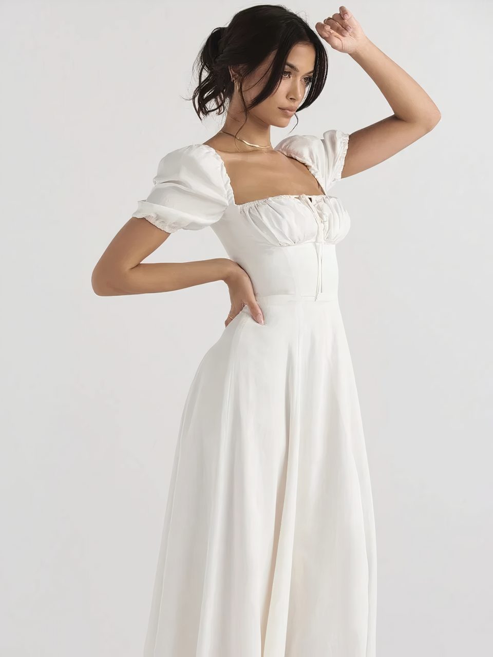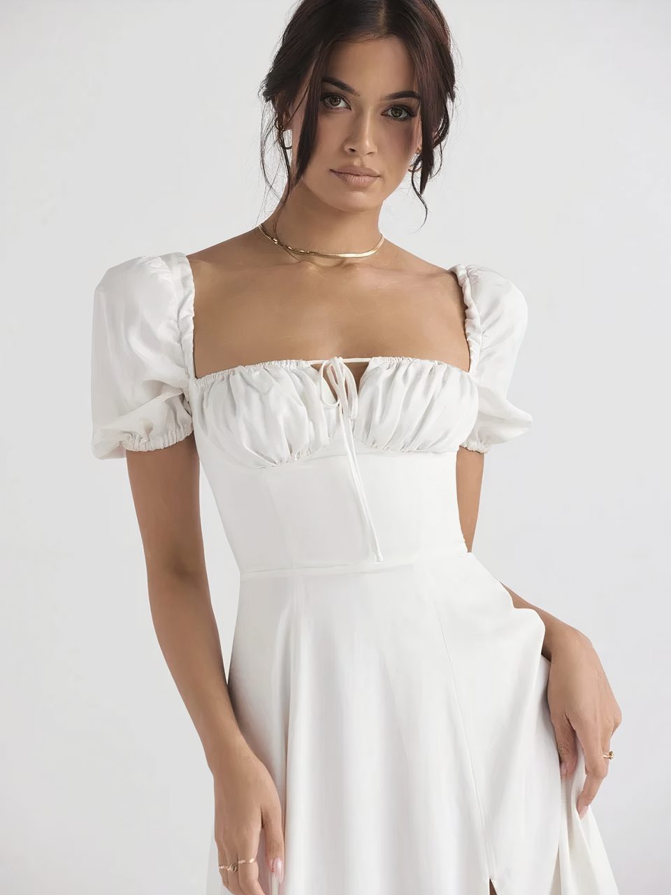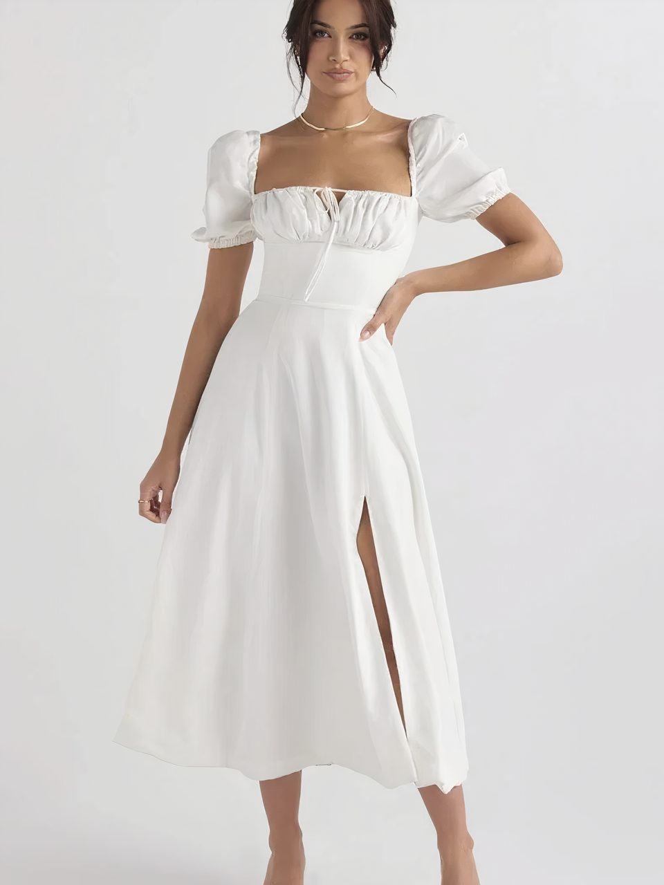 Inspirée par la mode de l'époque victorienne, cette robe Bridgerton incarne le glamour et le luxe tout en étant retravaillé de façon contemporaine. Sa longueur midi et sa fente sur le côté, la rendent encore plus glamour. Sa jupe fluide vous suit avec volupté à chaque pas, en laissant paraitre sensuellement une jambe.