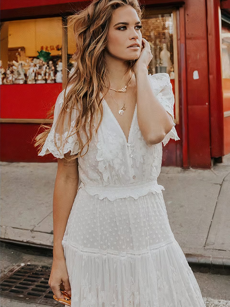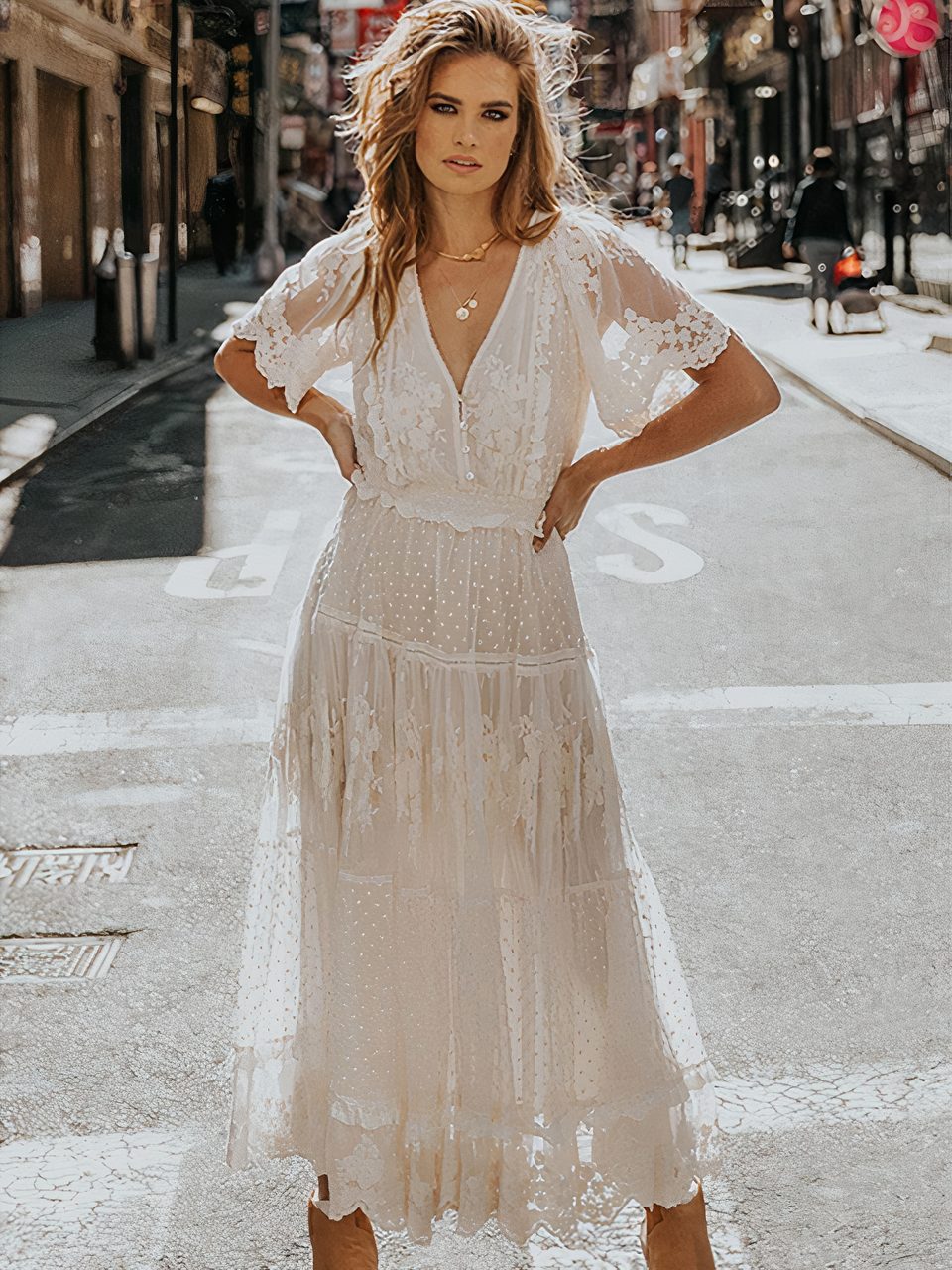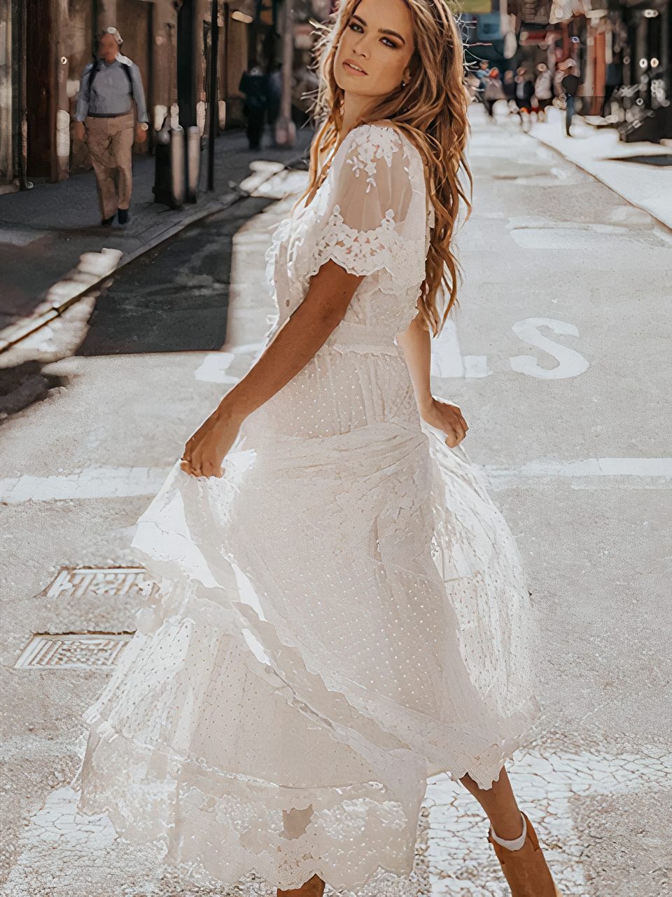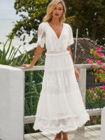 Sa dentelle délicate et raffinée avec des motifs floraux, des festons et des détails ajourés parfont le style champêtre et bohème de cette robe. Les manches courtes complètent également cette allure, ainsi, cette robe incarne à merveille un esprit romantique et élégant, tout en offrant confort et raffinement à celle qui la porte.