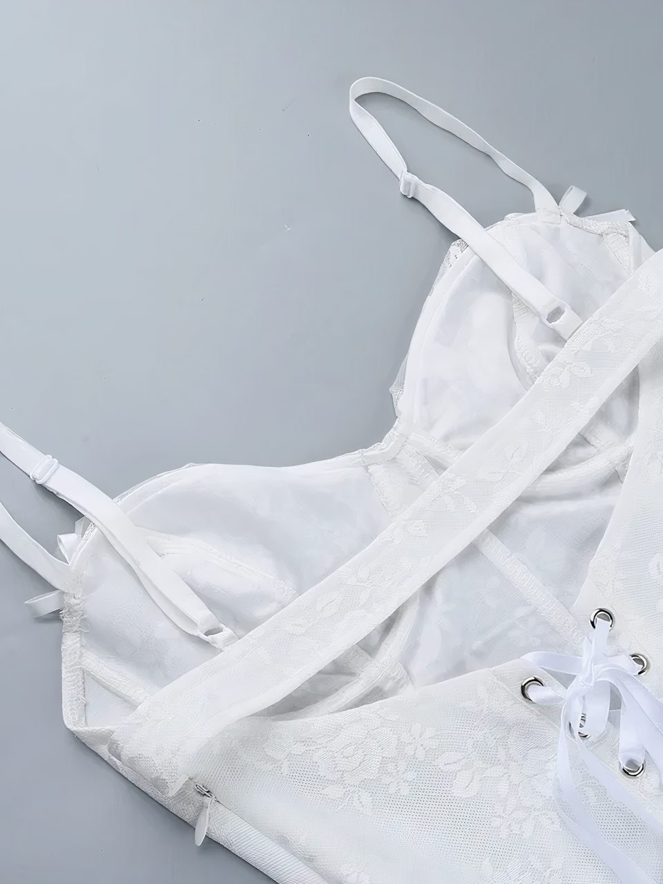 Succombez au charme de notre robe corset en dentelle. Le corset intégré permet de cintrer la taille et de créer une silhouette en sablier des plus flatteuses. Le décolleté apporte une touche de romantisme et de sophistication à l'ensemble, tandis que la jupe fluide et légère ajoute une note de grâce et de fluidité à la tenue.
