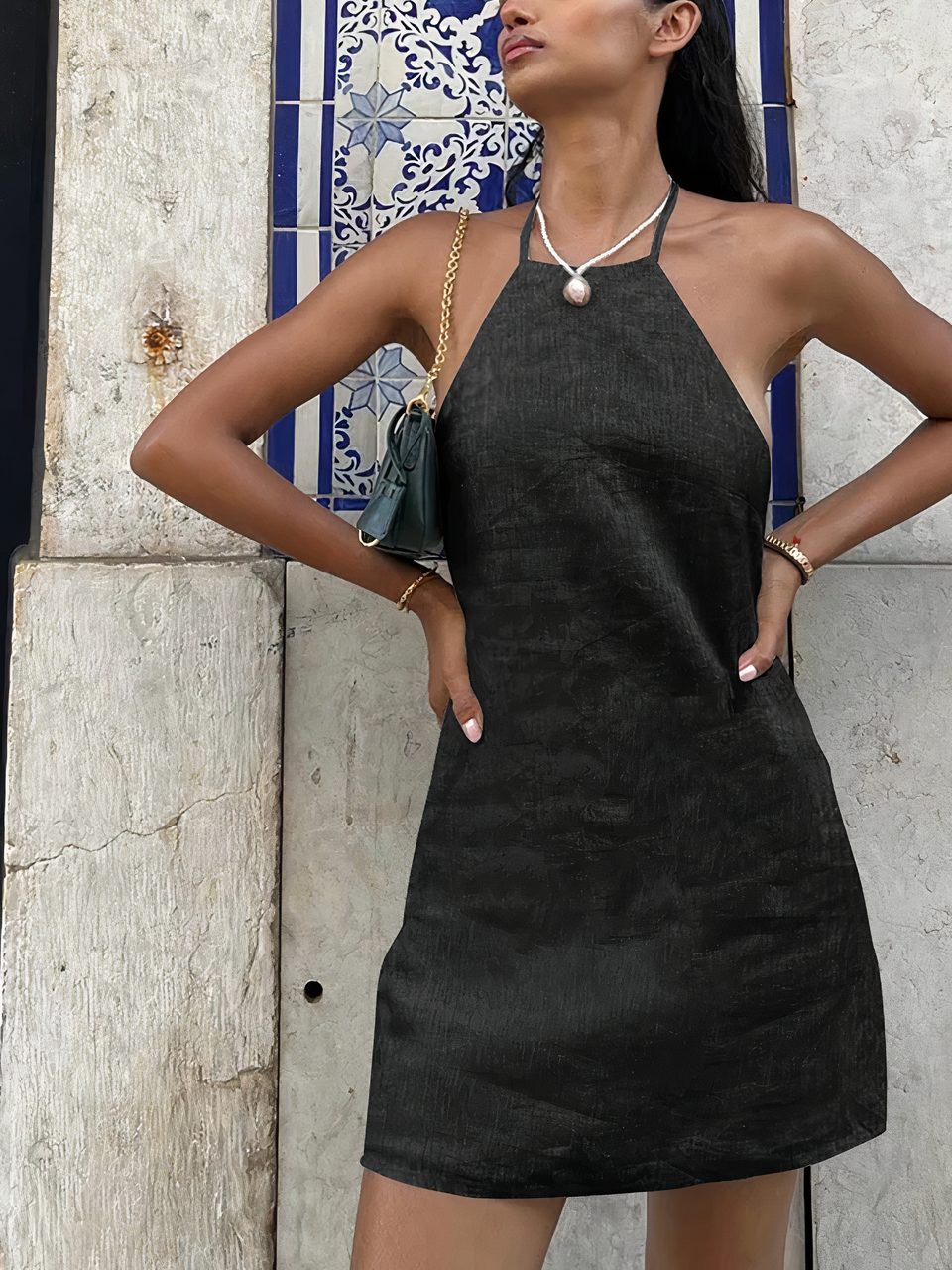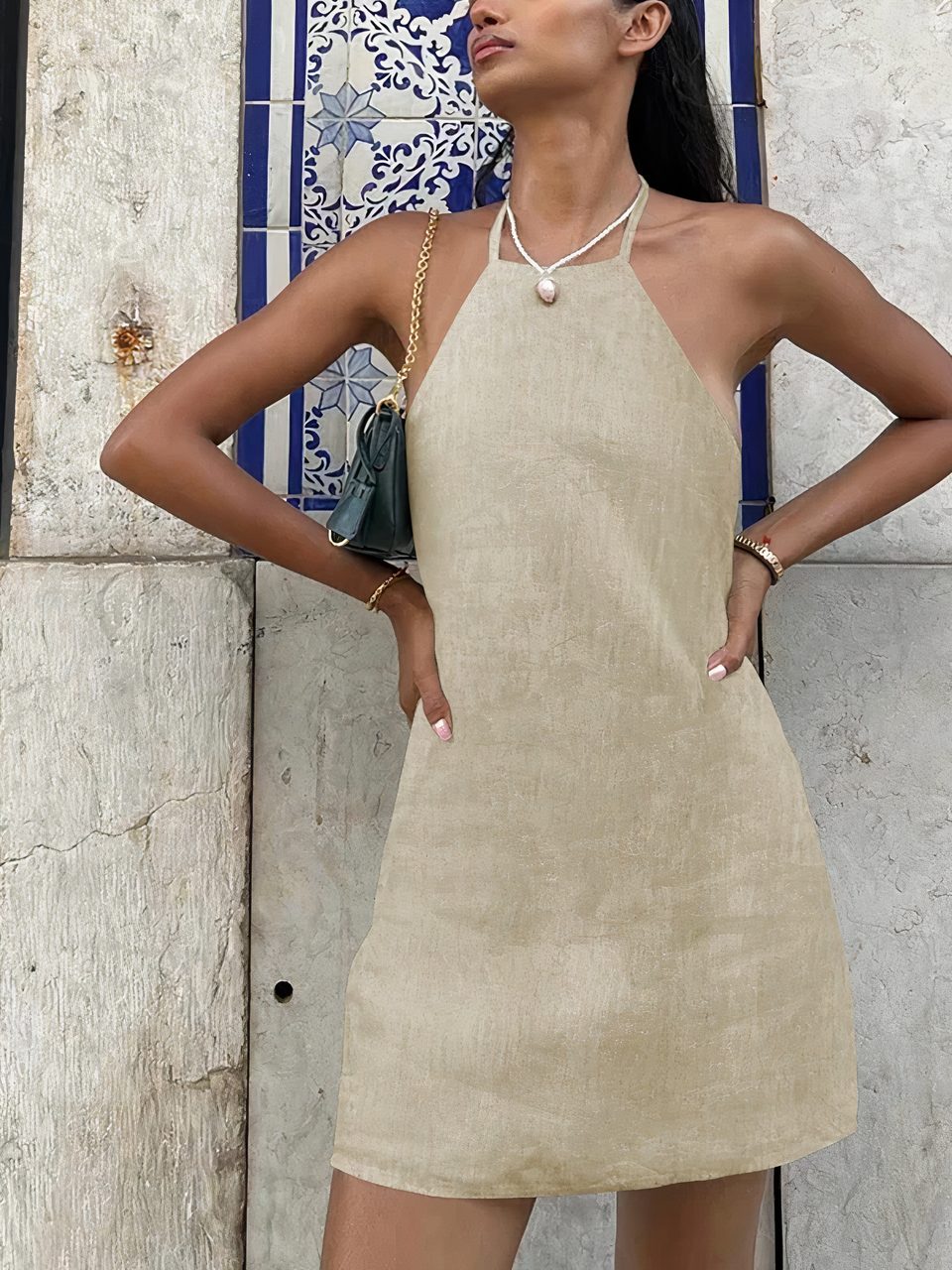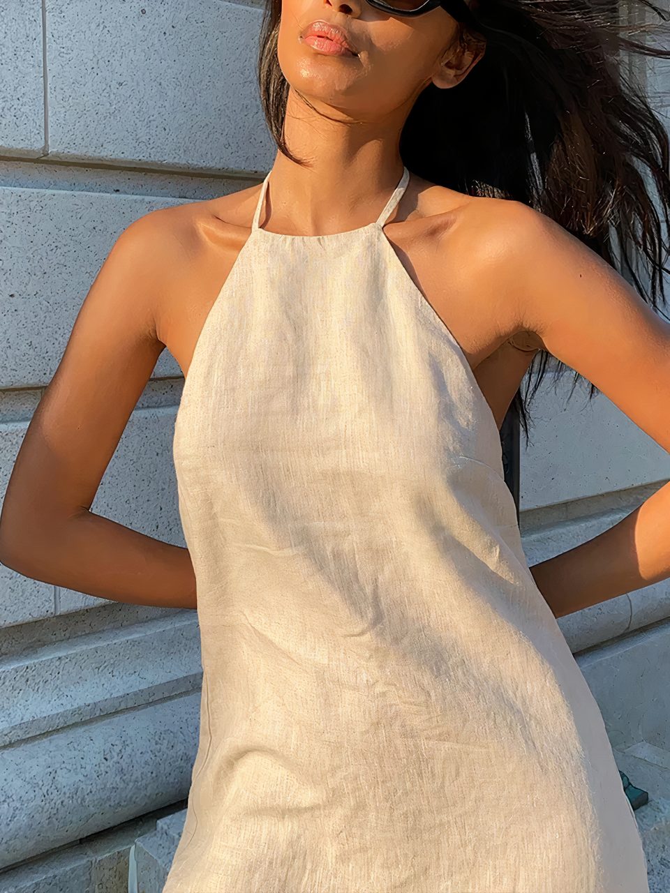 Notre mini robe dos nu est fabriquée dans un tissu en mélange de coton et de lin pour un rendu confortable, léger et respirant, doux sur la peau et agréable à porter. C'est un vêtement sexy très féminin qui allie confort et style. Son dos nu très profond en V ajoute de la sensualité et du glamour, tout comme les emmanchures très échancrées.