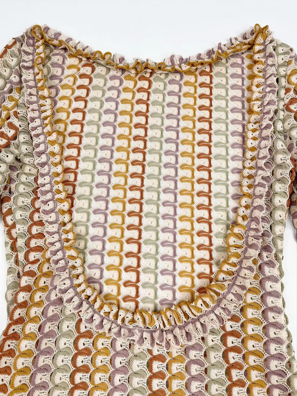 Le dos-nu dans la mode est toujours sexy et sensuel. Avec notre robe, ce principe se vérifie amplement. Le décolleté descend jusqu'à la taille pour laisser admirer la cambrure naturelle et la sublimer. Le détail des bords à froufrous toujours au crochet apporte une touche raffinée et romantique. Conçue pour être portée l'été, confortable, elle fera vite partie de vos préférées.