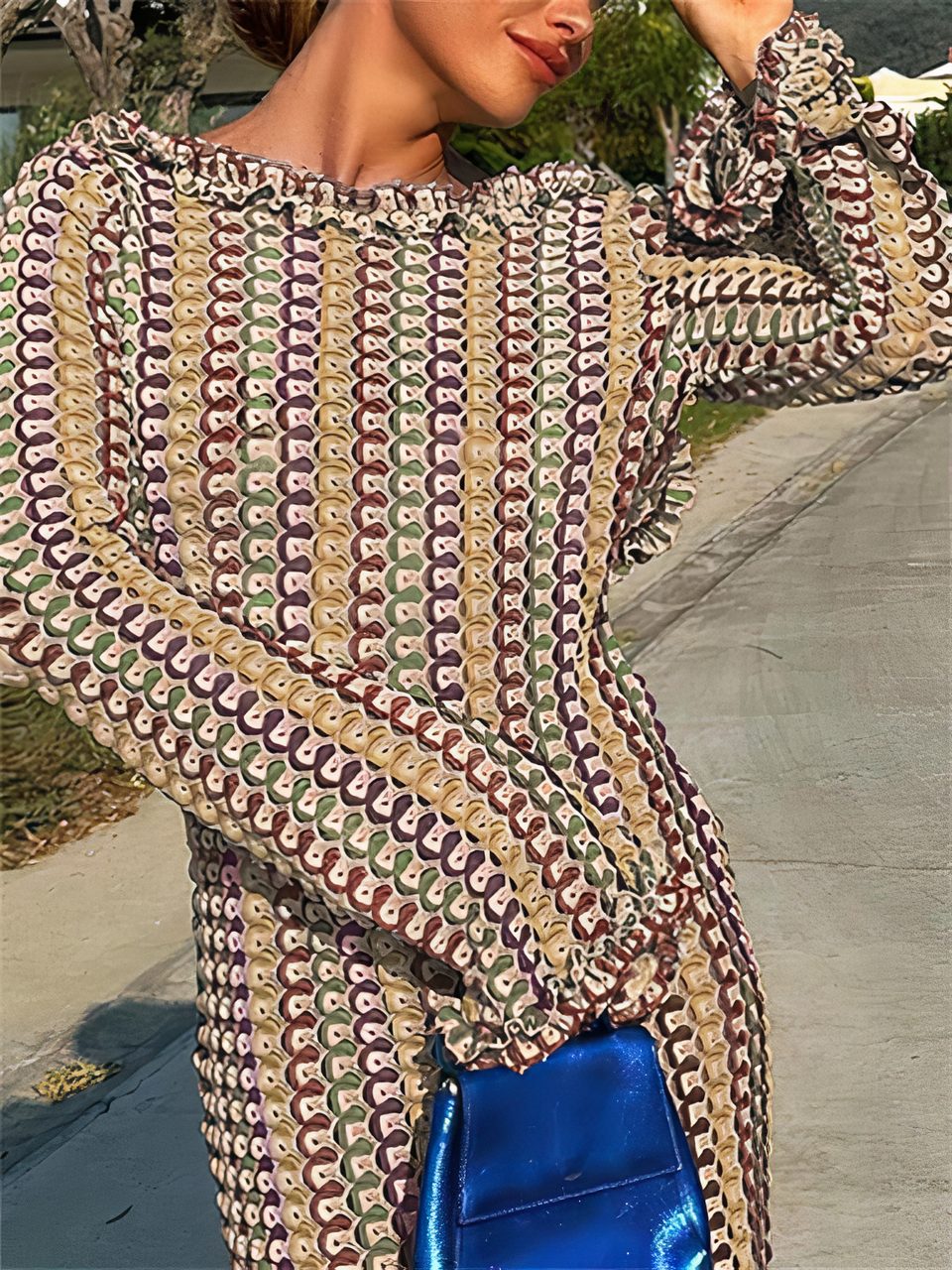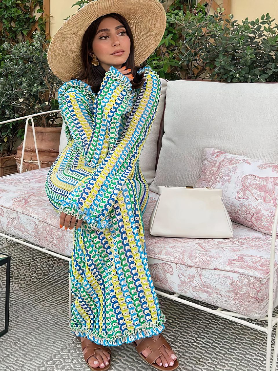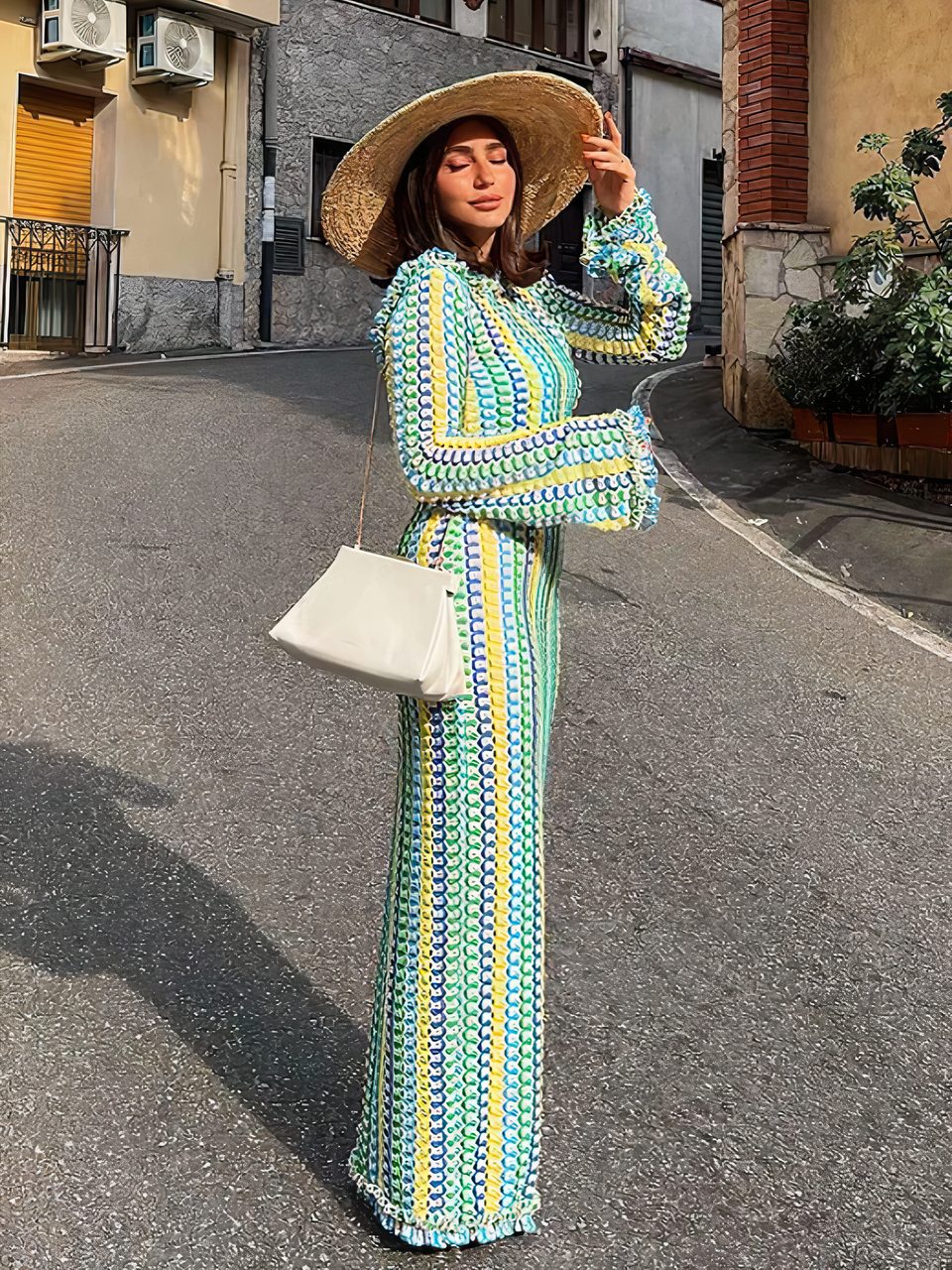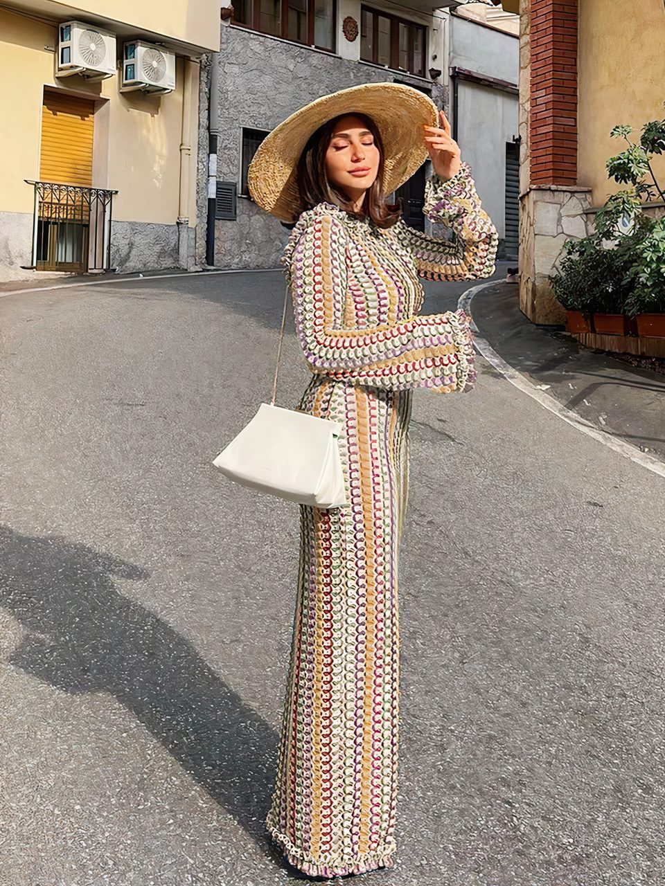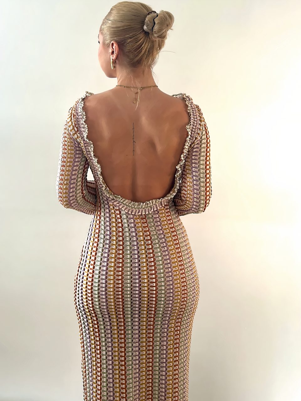 Notre robe dos nu au crochet est longue et possède un décolleté vertigineux très sexy. Elle est ultra féminine, avec une allure décontractée chic. Très moulante, elle met les courbes en valeur et ses manches longues évasées apportent une touche d'élégance au modèle. Confectionnée dans une maille assez grosse, avec des couleurs mêlées qui se complètent parfaitement, elle est originale et fraîche.