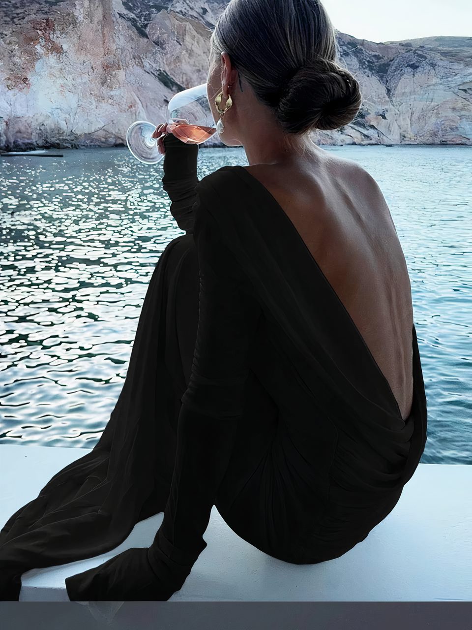 Cette magnifique robe dos-nu plissée à manches longues est l'incarnation de l'élégance et du glamour. Son tissu léger et fluide épouse parfaitement les courbes du corps en offrant un confort optimal du à la douceur et à l'élasticité de son tissu. Le décolleté plongeant dans le dos descend jusqu'à la taille et ajoute une touche de sensualité subtile, avec son effet drapé sophistiqué.