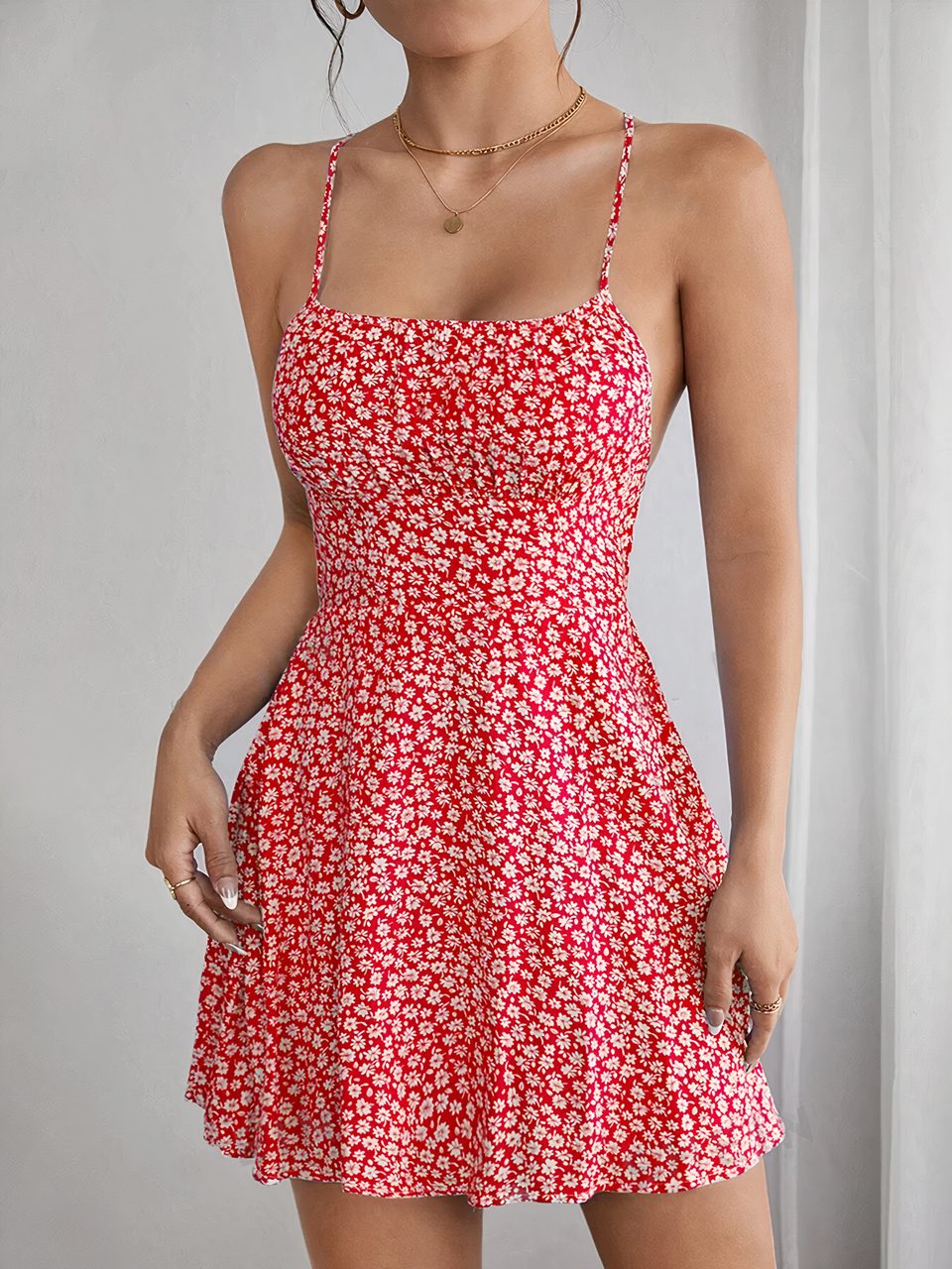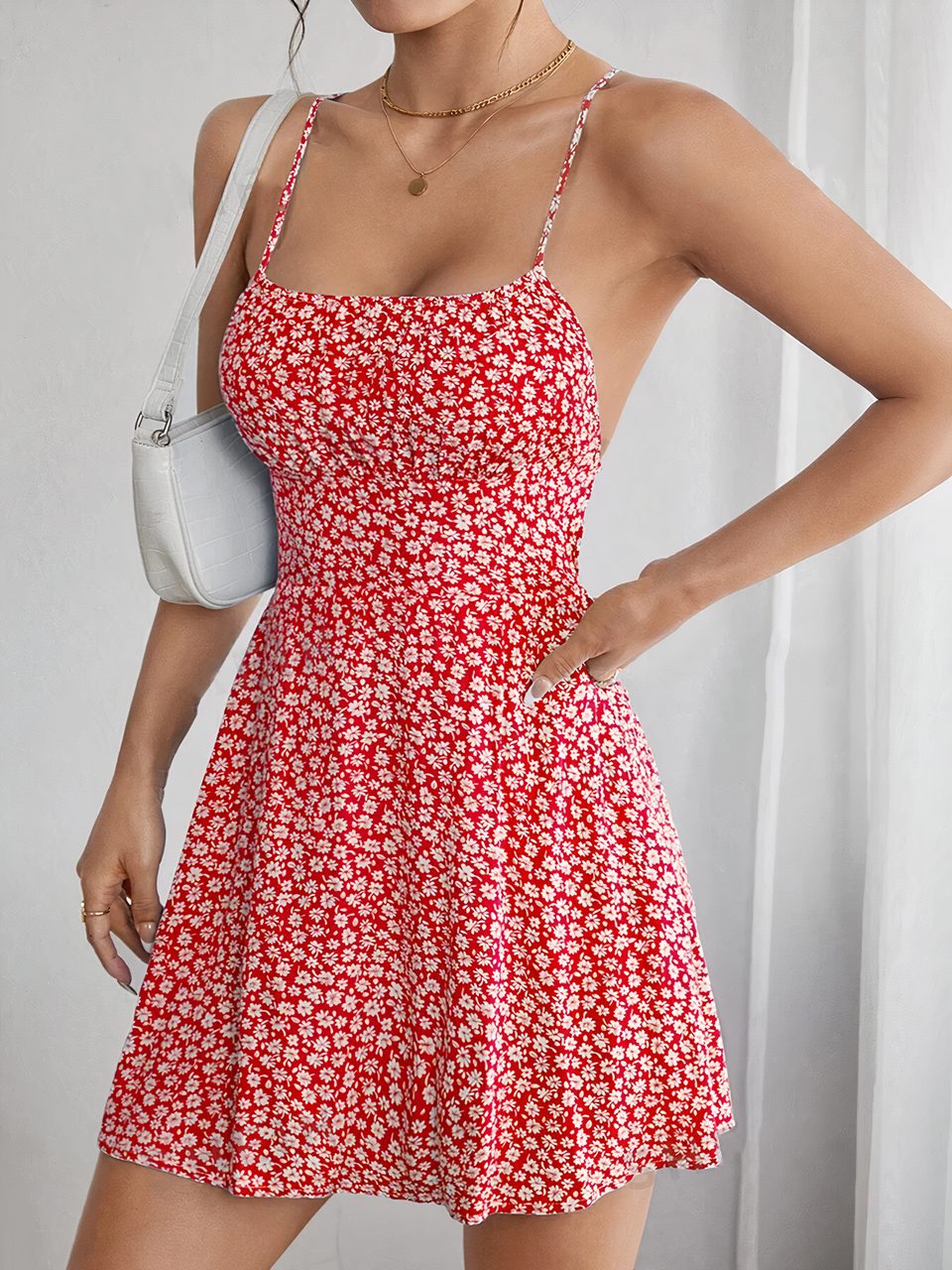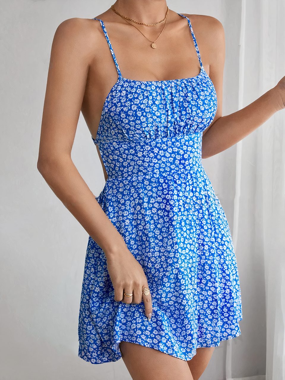 Robe fleurie courte à bretelles croisées dans le dos