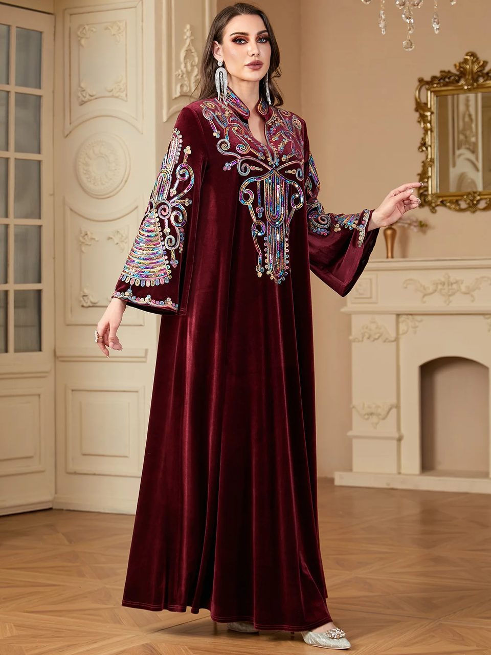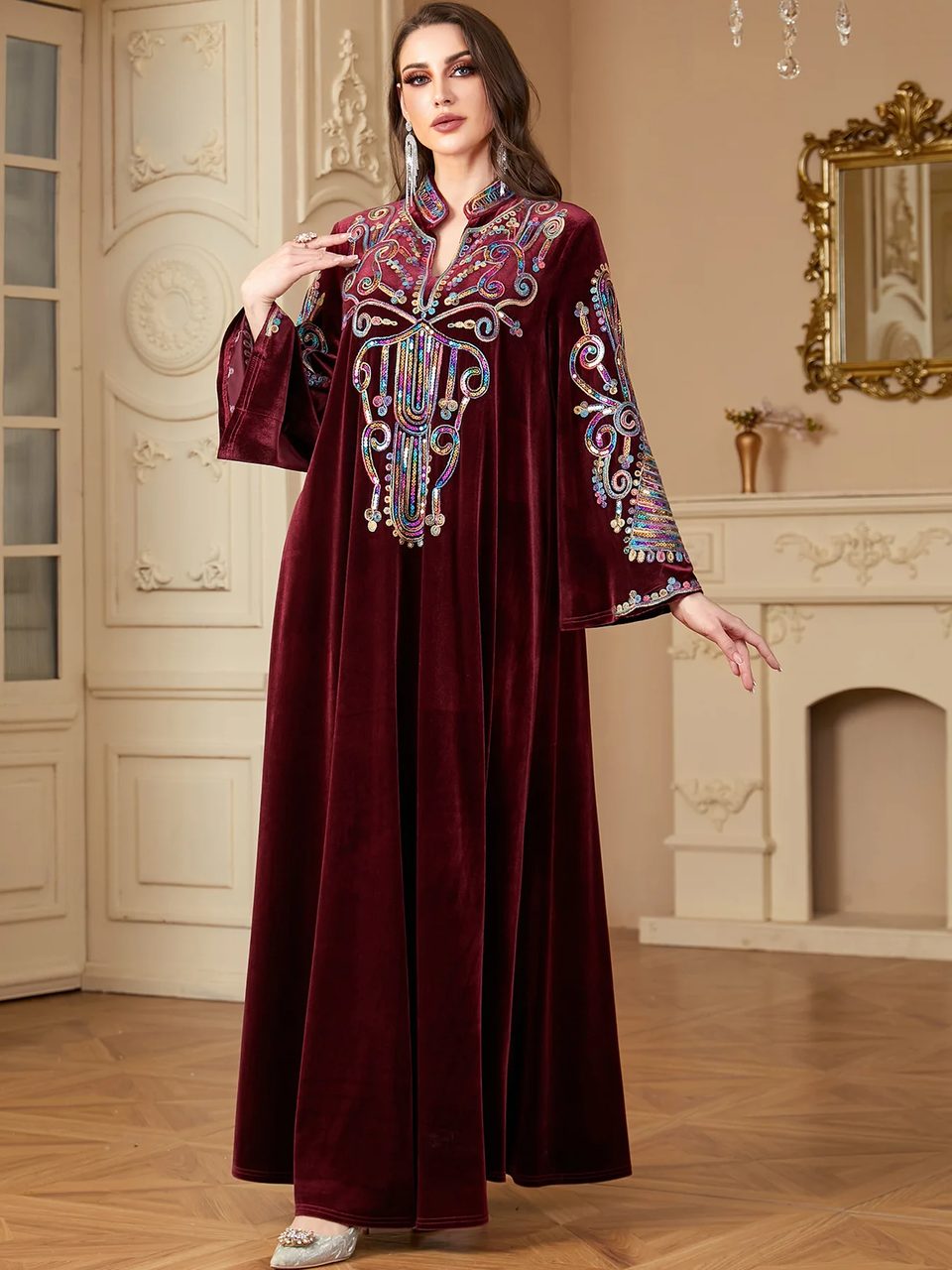 Fabriquée à partir d'un luxueux tissu de velours d'un bordeaux profond, cette robe est ornée de délicats motifs traditionnels kabyles tout en paillettes sur le devant et les manches, ce qui lui lui donne une allure élégante et un charme incroyable. Le confort est optimal, offert par la douceur du tissu et sa chaleur, à porter de préférence en automne-hiver. Les manches longues et amples finissent bien le look du modèle.