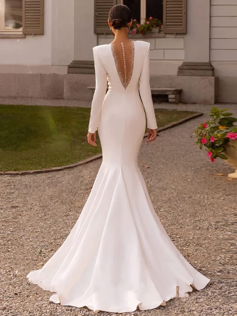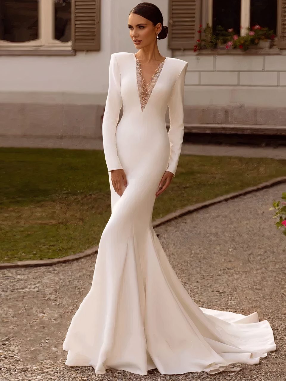 Notre robe de mariage sirène à manches longues est un choix élégant et sophistiqué pour une mariée moderne. Cette robe très ajustée épouse les courbes du corps, mettant la silhouette en valeur de manière flatteuse. Les manches longues ajoutent une touche de sophistication, et permettent à cette robe de se porter en saison fraîche.