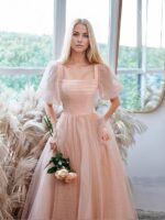 Le buste de cette robe est ajusté, il met la taille et la silhouette en valeur. Tel un corsage au dos, cette robe se noue pour s'ajuster parfaitement à votre tour de poitrine et à votre morphologie. Ses manches courtes bouffantes en tulle, ajoutent une touche romantique à l'ensemble. Le bas de la robe, évasé et vaporeux lui donne son allure princesse.