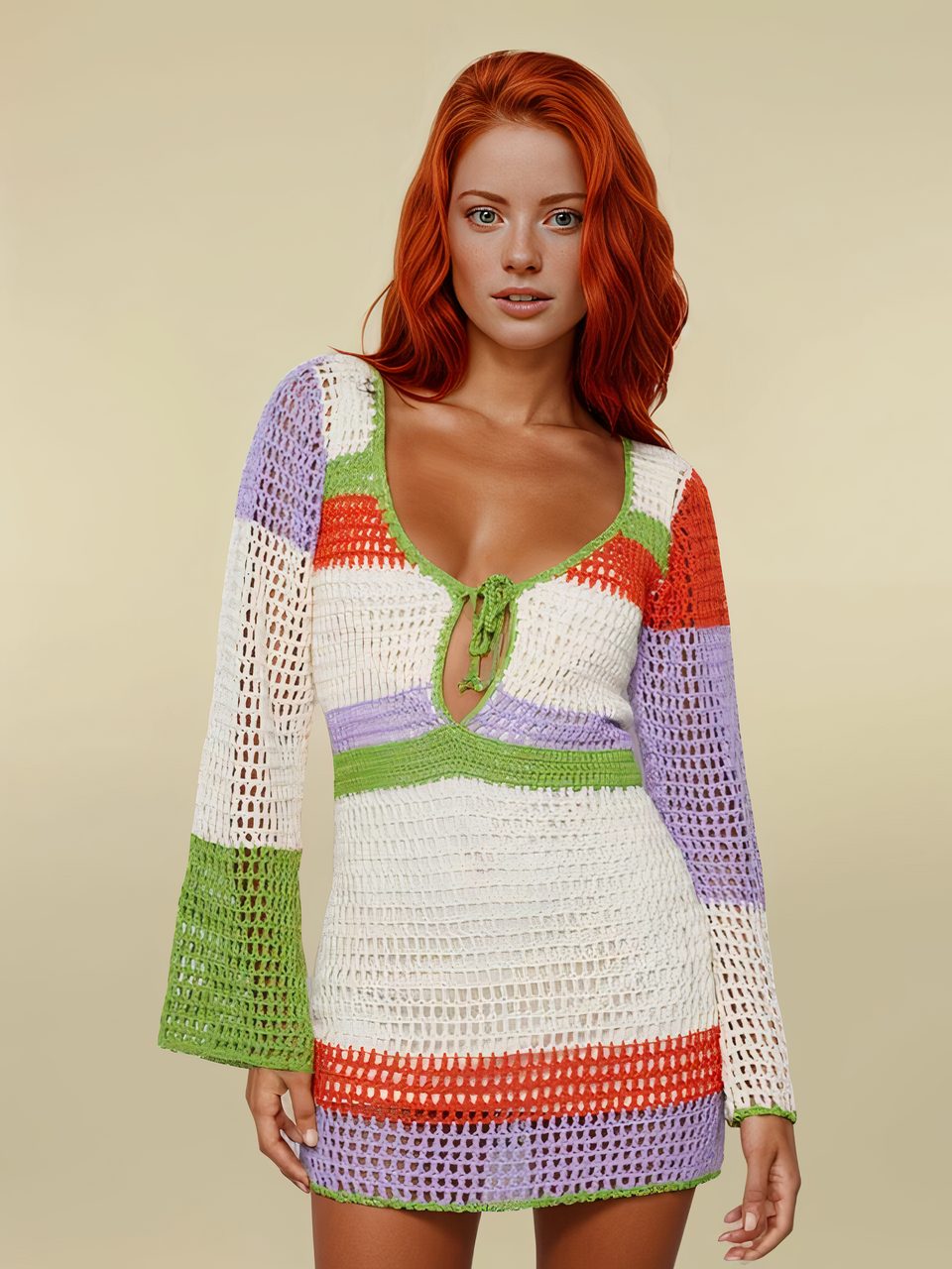 Le délicat motif au crochet apporte à cette robe une touche de romantisme, tandis que le large décolleté de forme ronde se finit par un lien à nouer qui ferme un joli décroché supplémentaire très sexy. La fibre douce qui compose la matière de ce vêtement rétro le rend léger, confortable, agréable et doux à porter. Les longues manches évasées donnent encore une dimension rétro des années 60-70 et apportent du chic à l'ensemble.