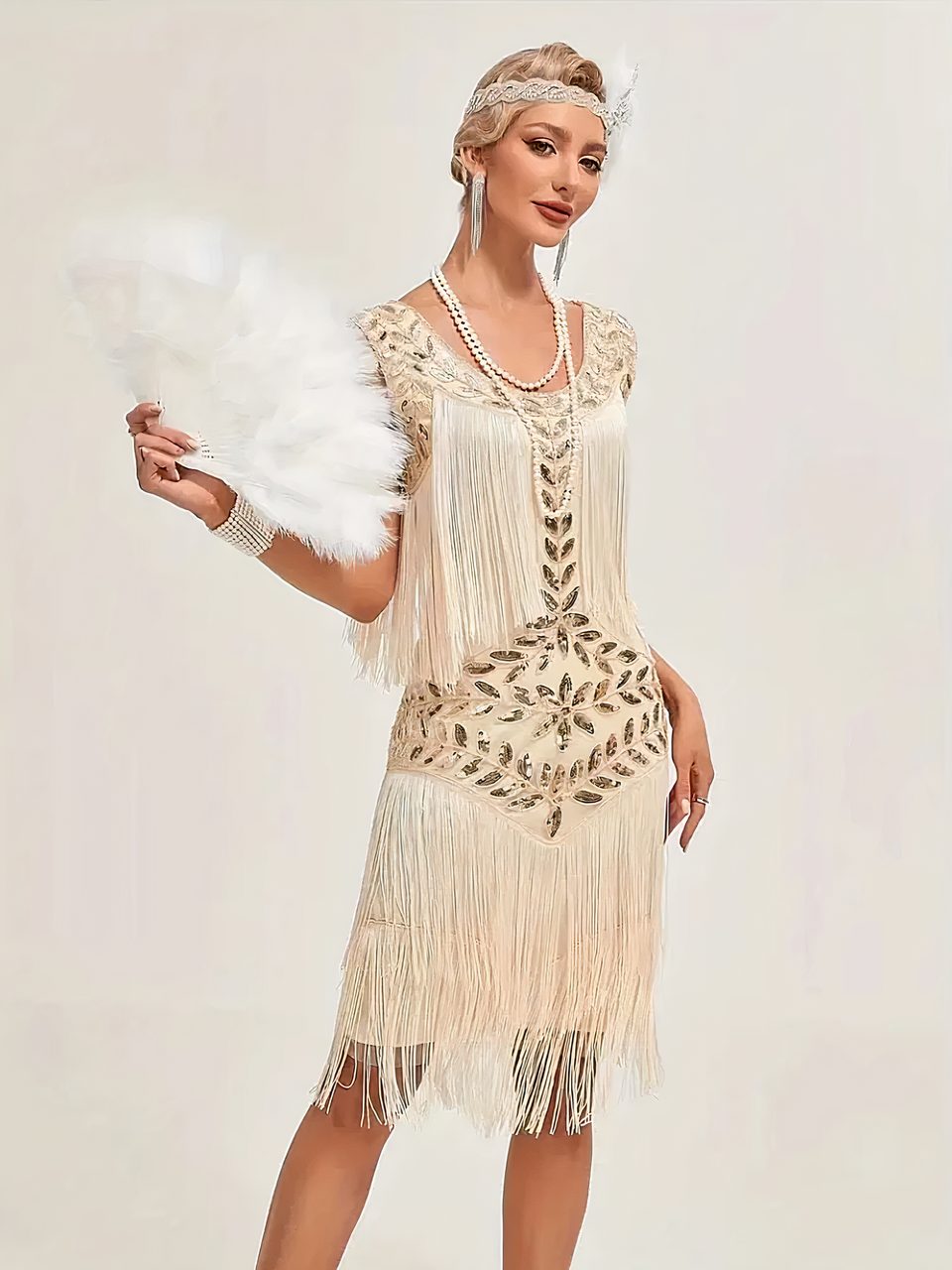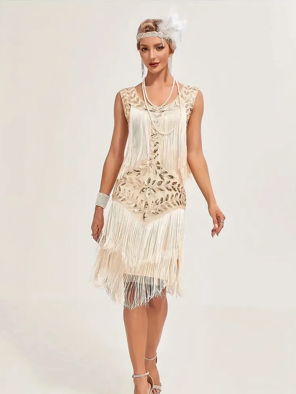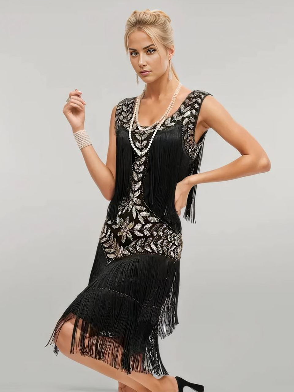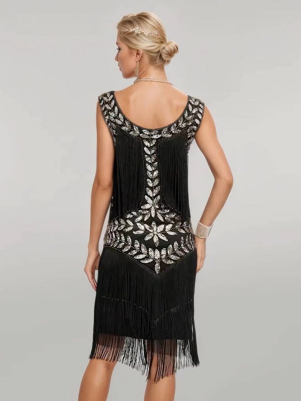 Les franges qui ornent cette robe années 20 sont nombreuses et rappellent le faste et l'élégance de la femme à cette époque. Elles sont rangées devant sur le buste en partant de la bande de l'encolure ronde, assez dégagée d'ailleurs, en suivant sur le dos. Elles descendent jusqu'à la découpe en biais de la taille pour laisser voir les motifs à paillettes. Le bas de la robe est doté de deux rangées de longues franges.
