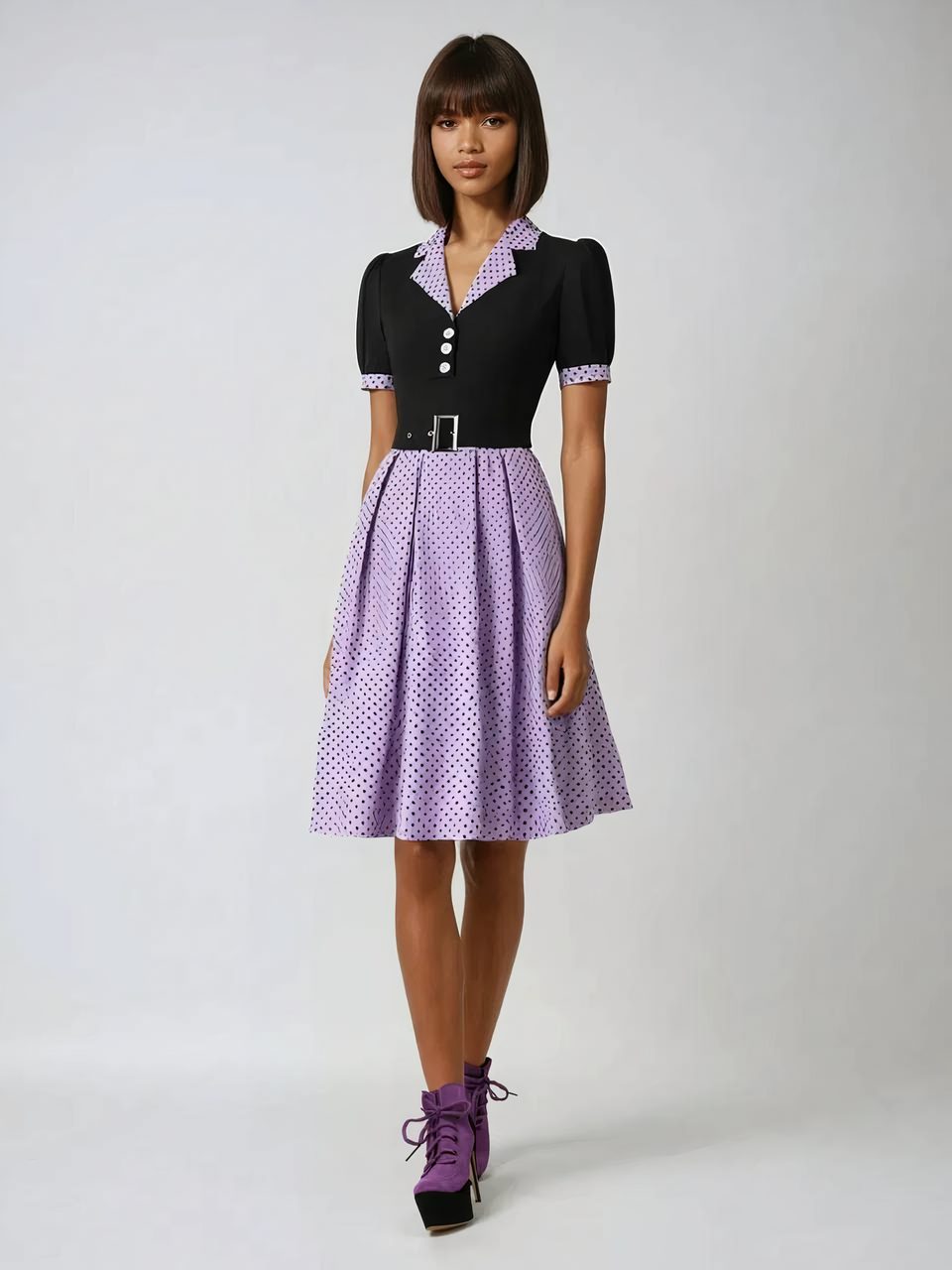 Le design de cette robe possède ce col cranté qui finit bien le haut en apportant une touche sophistiquée et rétro à l'ensemble. Le plissé délicatement réalisé sur la jupe ajoute du volume et du mouvement à la tenue, pour une silhouette féminine et gracieuse. Parfaite dans la journée en ville ou en cours comme à l'époque, ou pour une soirée chic ou un événement spécial, cette robe saura attirer les regards.