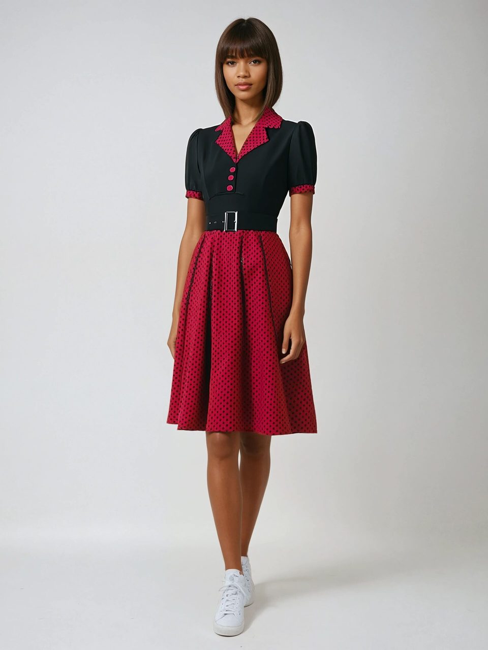 Notre robe rétro chic de style années 50 rappelle les tenues des jeunes filles sages, coiffées de rubans dans les cheveux et de chaussettes courtes. Associée à des escarpins à talons hauts, elle changera pourtant de look et sera glamour avec un côté irrésistible. Avec cette robe années 50 plissée, vous saurez jouer avec divers accessoires pour vous créer des looks personnalisés et être la reine du bal ou juste de la soirée.
