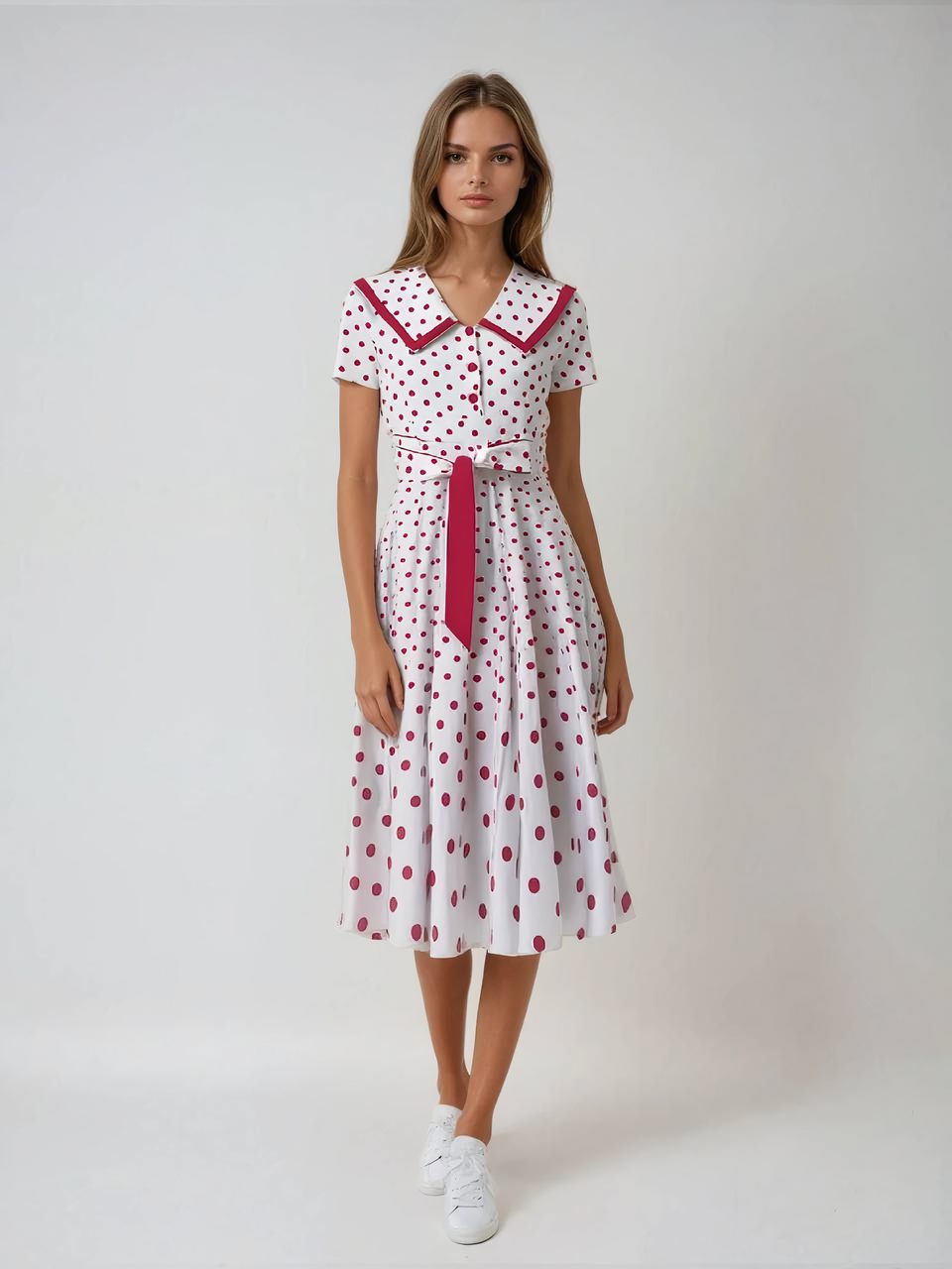 Le col carré de cette robe amène une touche sophistiquée et originale, tandis que les pois rappellent son côté vintage cependant parfaitement intemporel. Cette robe est idéale pour toutes les occasions, que ce soit pour une soirée, un cocktail entre amis ou même pour une journée au bureau. Son style classique, sa longueur au dessous du genou, en font un incontournable de tout dressing d'été féminin.