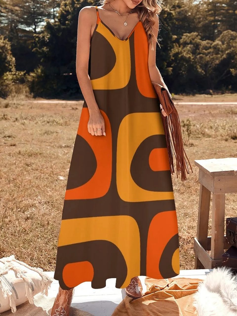 Robe années 70 longue imprimé géométrique