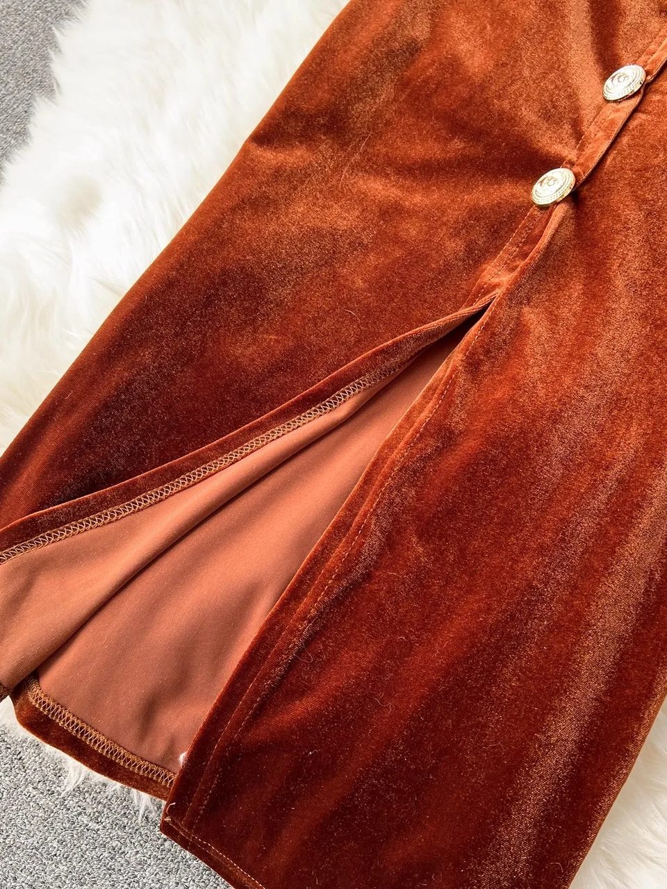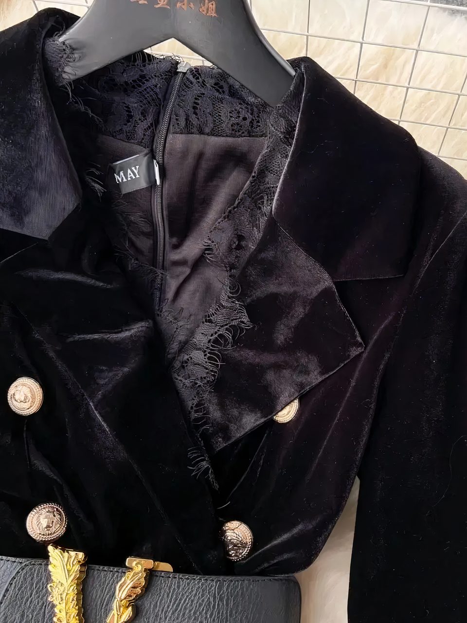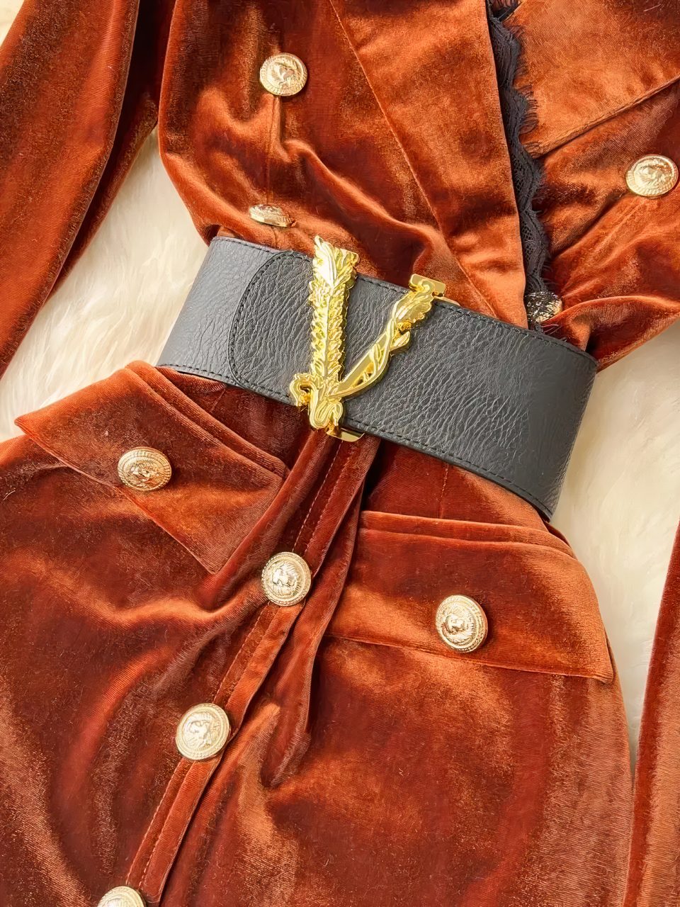 Le velours aux reflets riches confère à notre robe un charme intemporel et une allure vintage irrésistible. Son grand col cranté est orné d'une fine dentelle noire tout comme le bout des manches. Ces dernières sont longues et ajoutent une note classique et élégante. La longueur midi, c'est-à-dire au milieu du mollet, donne un côté chic et distingué. Notez aussi la fente un tantinet sexy du devant.